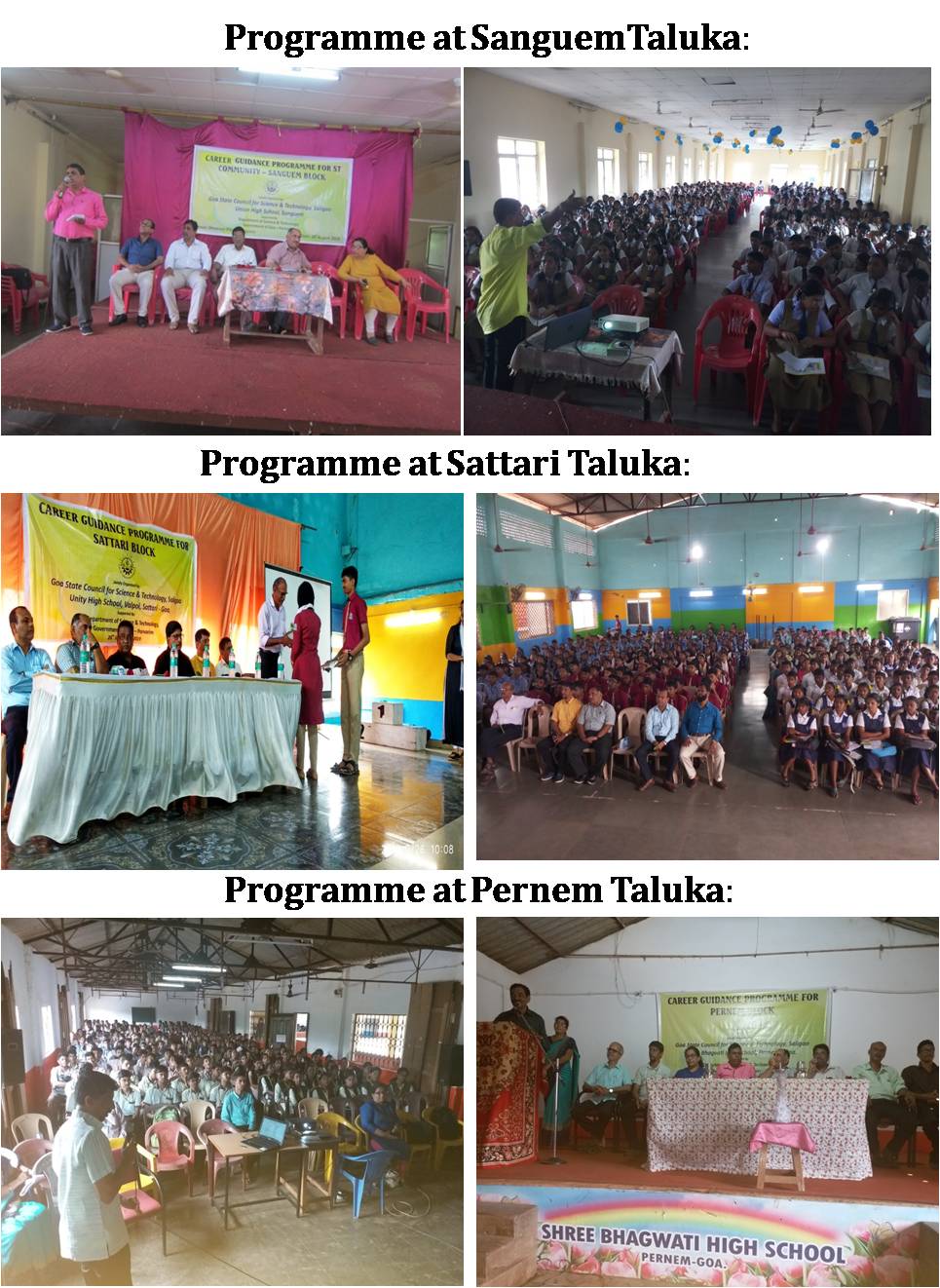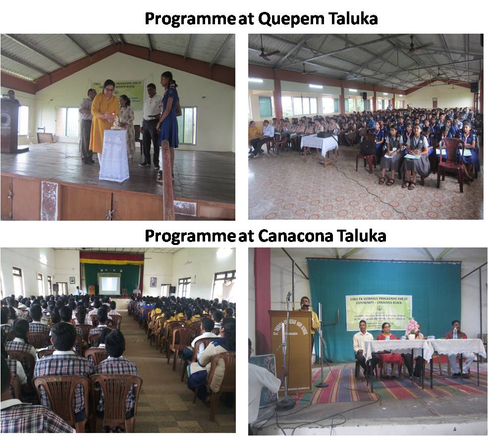 Five programmes, one each in Quepem, Canacona, Sanguem especially for ST. Community Students and Sattari and Pernem for any community involving 350 to 400 Students per programme took the benefit of the programme. The awareness created has really helped the students especially of ST community to promote & pursue education in Science & Technology, encourage the students from ST community to enrol for employment oriented education in S & T and also provided information to the students for the competitive exams such as Kishori Vigyan Puraskar Yojana, Joint Entrance Examination (JEE) main, JEE Advanced, BITSAT, VIT University Engineering Entrance Exam (VITEEE), NATA, NEET etc. was achieved.